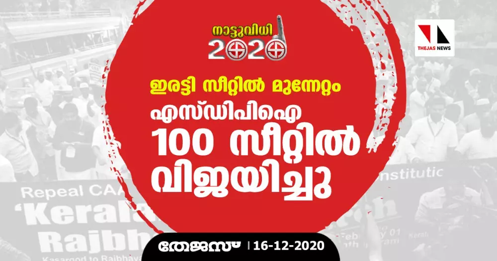 കോഴിക്കോട്: തദ്ദേശ തിരഞ്ഞെടുപ്പില് മികച്ച മുന്നേറ്റവുമായി എസ്ഡിപിഐ. സംസ്ഥാനത്ത് ഇതുവരെ 100 വാര്ഡുകളില് എസ്ഡിപിഐ സ്ഥാനാര്ഥികള് വിജയിച്ചു. മൂന്ന് മുന്നണികളോട് തനിച്ച് മല്സരിച്ചാണ് എസ്ഡിപിഐ മികച്ച നേട്ടം കൊയ്തത്.