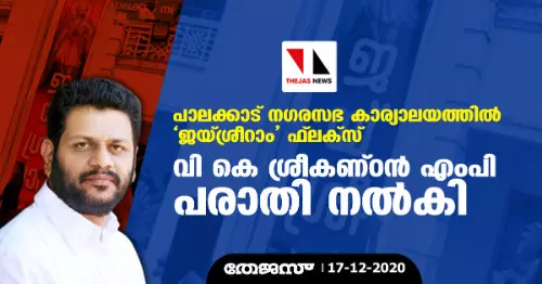 പാലക്കാട് നഗരസഭ കാര്യാലയത്തില് 'ജയ്ശ്രീറാം' ഫ്ലക്സ്: വി കെ ശ്രീകണ്ഠന് എംപി പരാതി നല്കി