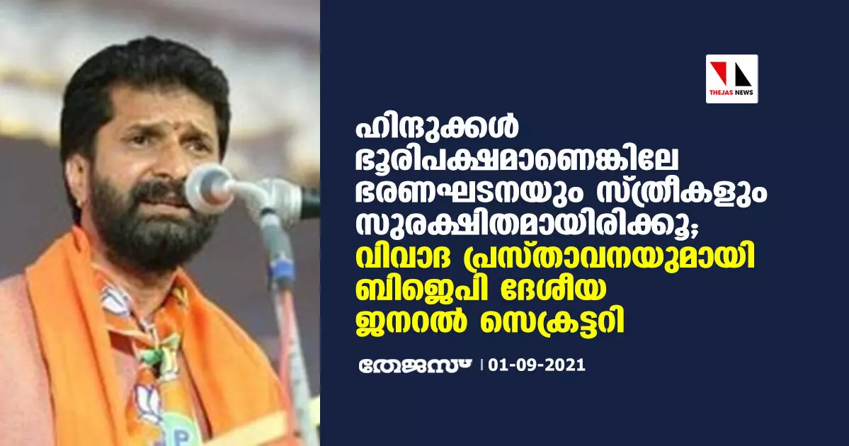 ഹിന്ദുക്കള് ഭൂരിപക്ഷമാണെങ്കിലേ ഭരണഘടനയും സ്ത്രീകളും സുരക്ഷിതമായിരിക്കൂ; വിവാദ പ്രസ്താവനയുമായി ബിജെപി ദേശീയ ജനറല് സെക്രട്ടറി
