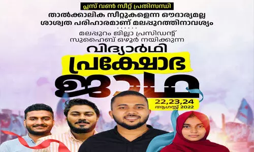 'താല്ക്കാലിക സീറ്റുകളെന്ന ഔദാര്യമല്ല, ശാശ്വത പരിഹാരമാണ് മലപ്പുറത്തിനാവശ്യം' എന്ന പ്രമേയത്തില് നടത്തുന്ന പ്രക്ഷോഭ ജാഥയില് ജില്ലാ പ്രസിഡന്റ് സുഹൈബ് ഒഴൂര് ജാഥാ ക്യാപ്റ്റനും വി എസ് അര്ഷഖ് ഷര്ബാസ്, ജിഹാന് ബഷീര് എന്നിവര് വൈസ് ക്യാപ്റ്റന്മാരുമാണ്. യൂനുസ് വെന്തൊടിയാണ് ജാഥാ മനേജര്.ശാമിര് എടവണ്ണ,ജുഹാന ഹസീന്,മുഹമ്മദ് അലി,മുസ്തഫ വളാഞ്ചേരി,സഫ്വാന് അയങ്കലം എന്നിവരെ ജാഥാഗംങ്ങളായും തിരഞ്ഞെടുത്തു.