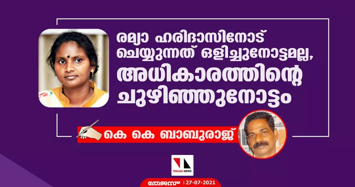 ആലത്തൂര് എം.പിയായ രമ്യ ഹരിദാസിനു മേല് മാര്ക്സിസ്റ്റു പാര്ട്ടിയുടെ അണികളും അവരുടെ പ്രൊപ്പഗണ്ട ബുദ്ധിജീവികളും നടത്തുന്നത് വെറും ഒളിനോട്ടമാണോ? അതില് ഒരു സ്ത്രീയോടോ ദളിതയോടൊ കാണിക്കേണ്ടതായ സഹഭാവത്തിന്റെ, നീതിബോധത്തിന്റെ കണികയെങ്കിലുമുണ്ടോ? ഇല്ലെന്നതാണ് വസ്തുത. മറിച്ചു, അവര് നടത്തുന്നത് അധികാരത്തിന്റെ ''ചുഴിഞ്ഞു നോട്ട'' മാണ് .