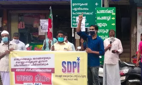 പല്ലാരിമംഗലം: രാജ്യത്തെയും ജനങ്ങളെയും കൊള്ളയടിക്കുകയും ഇന്ധന വില ദിനംപ്രതി വര്ദ്ധിപ്പിക്കുകയും ചെയ്യുന്ന മോദി സര്ക്കാരിനെതിരെയുള്ള പ്രതിഷേധത്തിന്റെ ഭാഗമായി എസ്ഡിപിഐ സമരദിനം ആചരിച്ചു. സംസ്ഥാന കമ്മിറ്റിയുടെ നിര്ദേശപ്രകാരം സംസ്ഥാനത്തുടനീളം 2020 ജൂലായ് 6 നാണ് സമരദിനം ആചരിച്ചത്. ഇതിന്റെ ഭാഗമായി പല്ലാരിമംഗലം പഞ്ചായത്ത് കമ്മിറ്റിയുടെ ആഭിമുഖ്യത്തില് ആടിവാട് വച്ച് നടന്ന പ്രതിഷേധത്തില് ടു വീലറുകള് തള്ളി കൊണ്ട് പ്രവര്ത്തകര് അണിനിരന്നു. പ്രതിഷേധ പരിപാടിയുടെ ഉദ്ഘാടനം മണ്ഡലം പ്രസിഡന്റ് മൂസ തടത്തികുന്നേല് നിര്വഹിച്ചു.