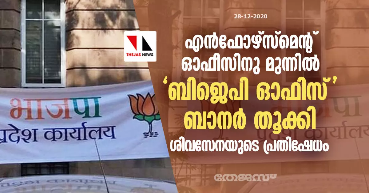 എന്ഫോഴ്സ്മെന്റ് ഓഫീസിനു മുന്നില് 'ബിജെപി ഓഫിസ്' ബാനര് തൂക്കി ശിവസേനയുടെ പ്രതിഷേധം