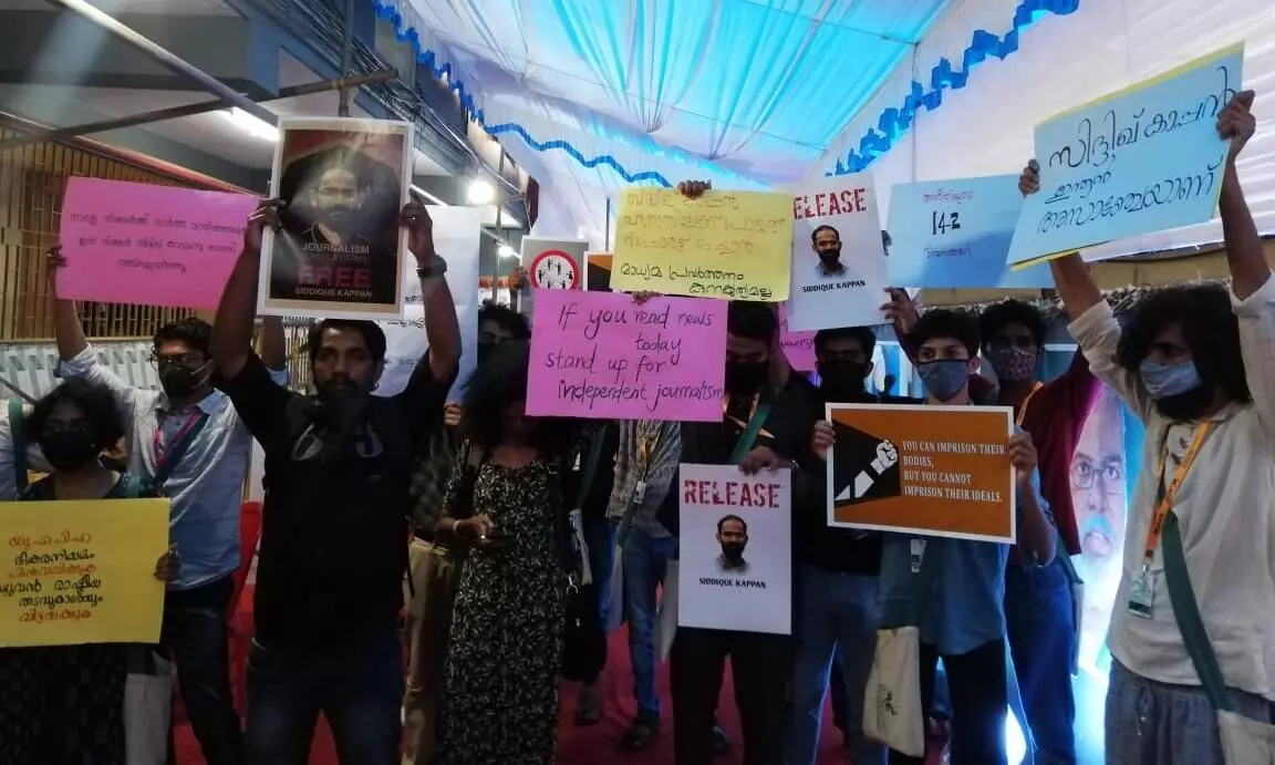 തലശ്ശേരി: യു പി പോലീസ് അറസ്റ്റു ചെയ്ത മലയാളി മാധ്യമപ്രവര്ത്തകന് സിദ്ദീഖ് കാപ്പനെ വിട്ടയക്കണമെന്ന് ആവിശ്യപ്പെട്ട് സ്വാതന്ത്ര്യ മാധ്യമ പ്രവര്ത്തകരും സിനിമാ പ്രേമികളും തലശ്ശേരിയിലെ ഐഎഫ്എഫ്കെ വേദിയില് പ്രതിഷേധിച്ചു. ചലച്ചിത്ര അക്കാദമി ചെയര്മാന് പ്രതിഷേധത്തിന് അഭിവാദ്യം അര്പ്പിച്ചു. ഹാറൂണ് കാവനൂര്, മൃദുല ഭവാനി തുടങ്ങിയവര് നേതൃത്വം നല്കി.