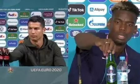 ജര്മനിക്കെതിരായ മത്സരത്തിനു ശേഷം നടത്തിയ വാര്ത്താസമ്മേളനത്തിനിടെ ഫ്രാന്സ് താരം പോള് പോഗ്ബ തന്റെ മുന്നിലിരുന്ന ഹെയ്ന്കെന് ബിയര് കുപ്പി എടുത്ത് മാറ്റിവച്ചു. ഇസ്ലാം മത വിശ്വാസിയായ പോഗ്ബ തന്റെ വിശ്വാസങ്ങള്ക്ക് എതിരായതിനാലാണ് ബിയര് കുപ്പികള് മാറ്റിവച്ചത്. കഴിഞ്ഞ ദിവസം ഇറ്റാലിയന് മധ്യനിര താരം മാനുവല് ലോക്കടെല്ലിയും കോക്ക കോല കുപ്പികള് എടുത്തുമാറ്റി. വെള്ളക്കുപ്പി എടുത്തുവച്ച് കൊക്കക്കോള കുപ്പികള് മാറ്റിവെക്കുകയായിരുന്നു അദ്ദേഹം.