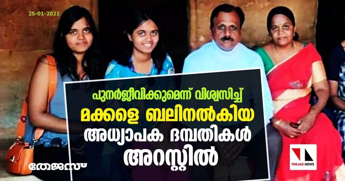 പുനര്ജീവിക്കുമെന്ന് വിശ്വസിച്ച് മക്കളെ ബലിനല്കിയ അധ്യാപക ദമ്പതികള് അറസ്റ്റില്