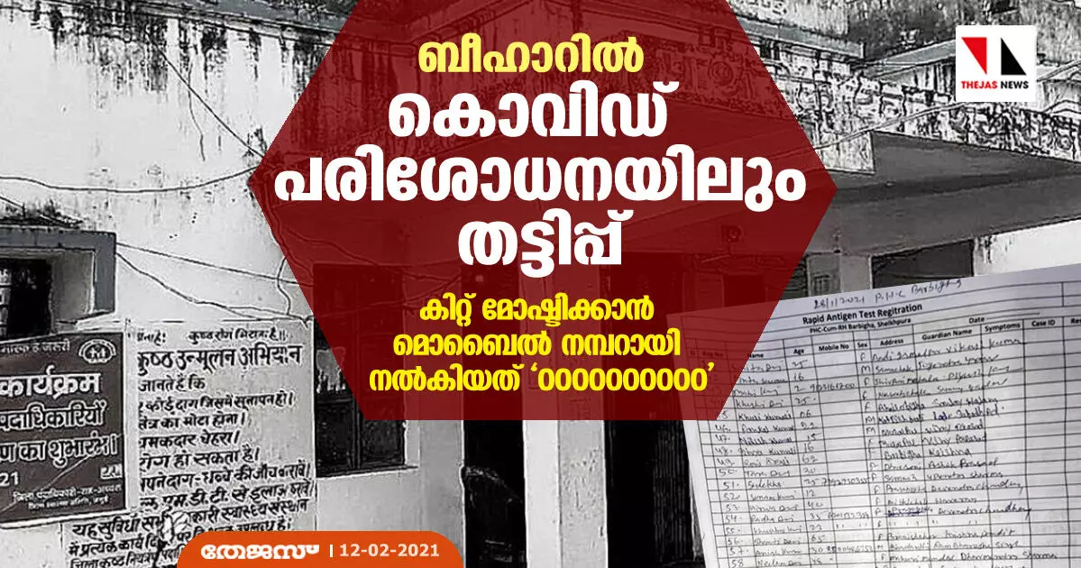 ജനുവരി മാസം ആറ് പിഎച്ച്സികളില് നടത്തിയ പരിശോധനകളില് 885 ലും ഫോണ് നമ്പര് ആയി 0000000000 ചേര്ത്തിരിക്കുന്നു. ജാമൂ, ഷേഖ്പുര, പട്ന തുടങ്ങിയവിടങ്ങളിലെ 6 പിഎച്ച്സികളിലാണ് ഇത് കണ്ടെത്തിയത്. പരിശോധന നടത്താതെ പരിശോധന നടത്തിയതായി രേഖയുണ്ടാക്കി കൊവിഡ് പരിശോധനാ കിറ്റ് മറച്ചുകൊടുക്കുന്നതിനുള്ള മാര്ഗമായാണ് ഇത് ഉപയോഗപ്പെടുത്തുന്നതെന്നാണ് പുറത്തുവന്ന വിവരം. ചിലര്ക്കത് പണം തട്ടലിനുള്ള മാര്ഗമല്ല, ജോലി ചെയ്തെന്ന് വ്യാജരേഖയുണ്ടാക്കുകയാണ് ലക്ഷ്യം.