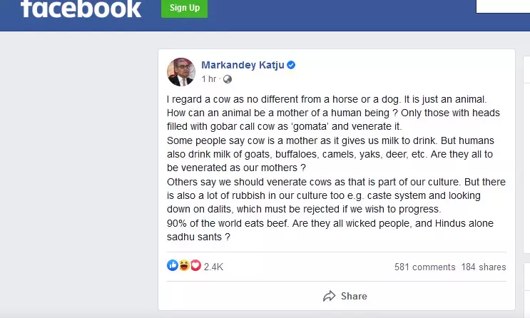 തലക്കുള്ളില് ചാണകമുള്ളവരാണ് പശുവിനെ ഗോമാതാവ് എന്നു പറയുന്നത്: ജസ്റ്റിസ് മാര്കണ്ഠേയ കട്ജു