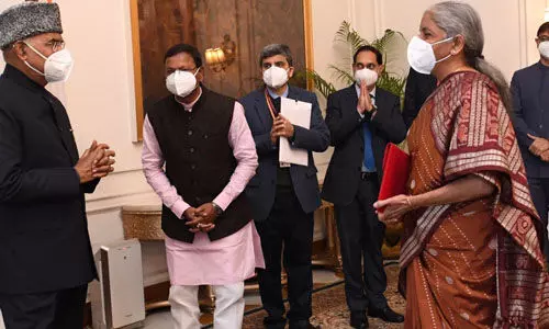 ധനമന്ത്രി നിര്മലാ സീതാരാമന് സഹമന്ത്രി ഡോ. ഭഗവത് കാരാട്, പങ്കജ് ചൗധരി, മറ്റ് മുതിര്ന്ന ഉദ്യോഗസ്ഥര് എന്നിവര്ക്കൊപ്പം 2022-23 സാമ്പത്തിക വര്ഷത്തേക്കുള്ള ബജറ്റ് അവതരിപ്പിക്കുന്നതിനു മുന്നോടിയായി രാഷ്ട്രപതി രാം നാഥ് കോവിന്ദിനെ സന്ദര്ശിച്ചു- രാഷ്ട്പതിമന്ത്രാലയം ട്വീറ്റ് ചെയ്തു.