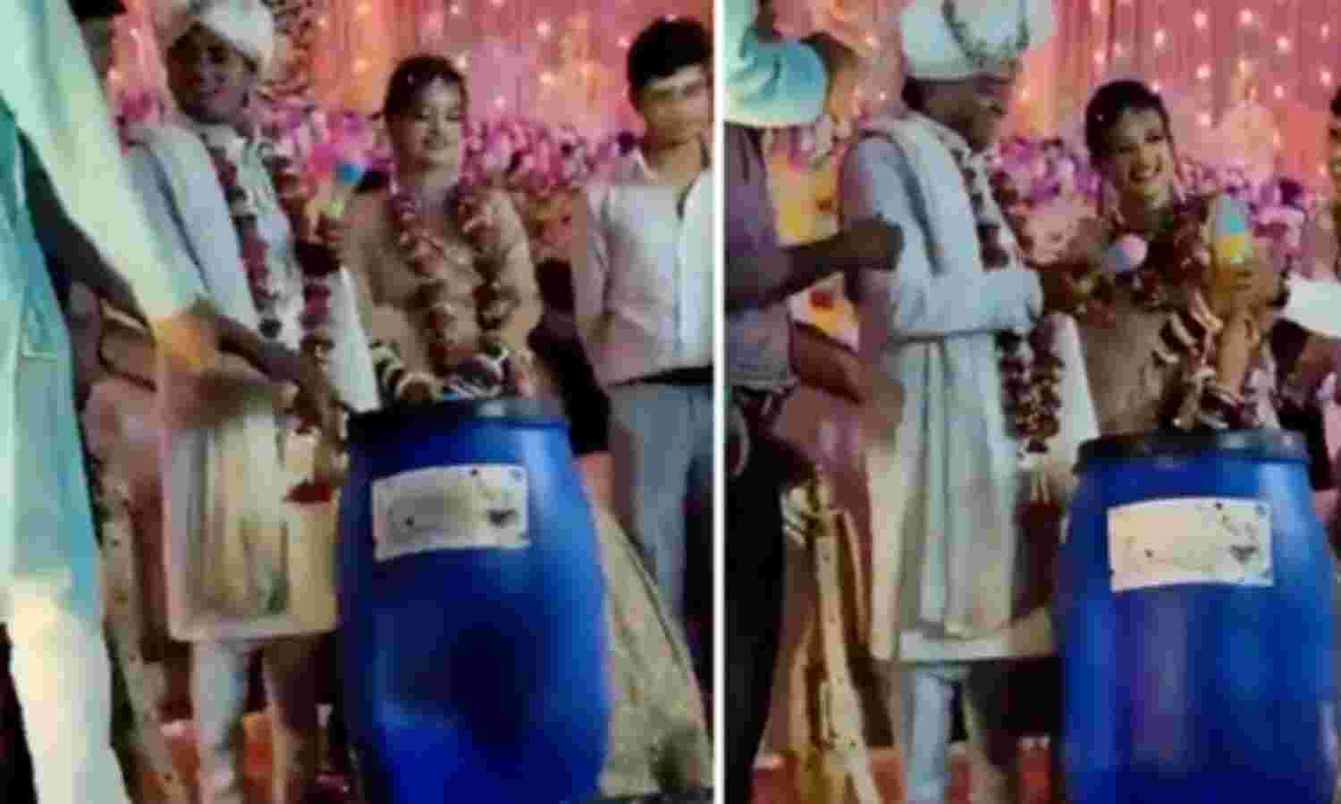 വിവാഹ ചടങ്ങില് നവദമ്പതികള്ക്ക് 'നീല ഡ്രം' സമ്മാനിച്ച് സുഹൃത്തുക്കള്; വിമര്ശിച്ച് നെറ്റിസണ്സ് (വീഡിയോ)