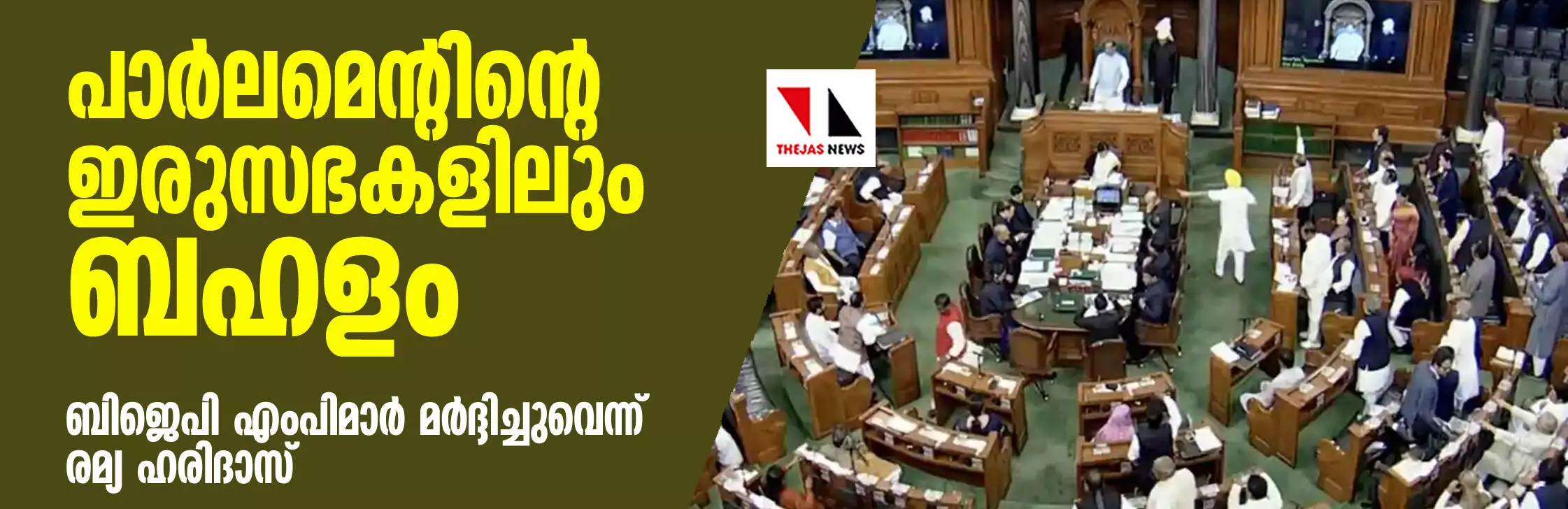 പ്രധാനമന്ത്രിയുടെയും ആഭ്യന്തര മന്ത്രിയുടെയും രാജി ആവശ്യപ്പെട്ട് ഇരു സഭകളിലും ബഹളം; ബിജെപിക്കാര് മര്ദ്ദിച്ചുവെന്ന് രമ്യ ഹരിദാസിന്റെ പരാതി