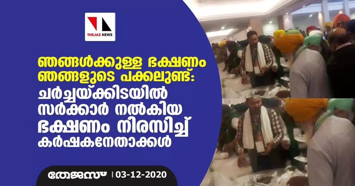 'ഞങ്ങള്ക്കുള്ള ഭക്ഷണം ഞങ്ങളുടെ പക്കലുണ്ട്': ചര്ച്ചയ്ക്കിടയില് സര്ക്കാര് നല്കിയ ഭക്ഷണം നിരസിച്ച് കര്ഷകനേതാക്കള്