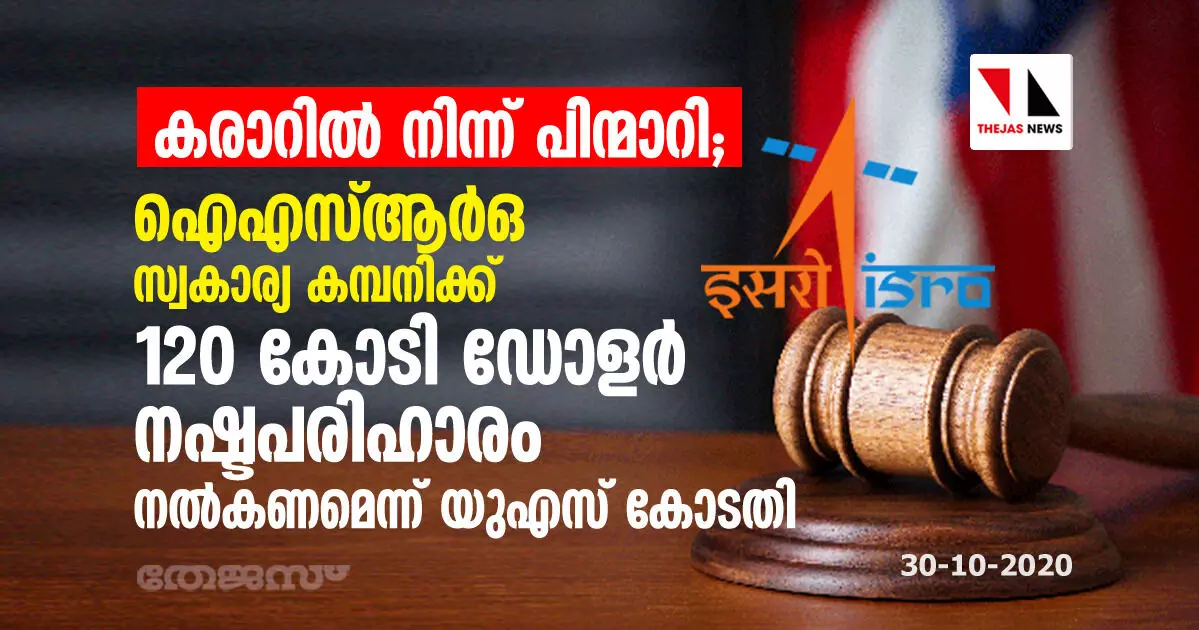 കരാറില് നിന്ന് പിന്മാറി: ഐഎസ്ആര്ഒ സ്വകാര്യ കമ്പനിക്ക് 120 കോടി ഡോളര് നഷ്ടപരിഹാരം നല്കണമെന്ന് യുഎസ് കോടതി