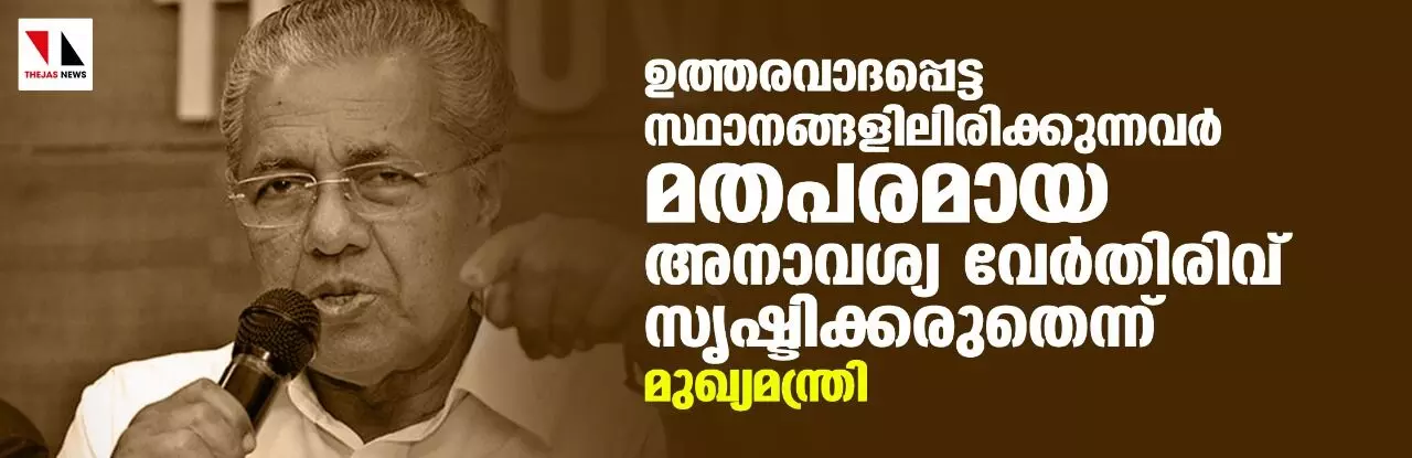 ഉത്തരവാദപ്പെട്ട സ്ഥാനങ്ങളിലിരിക്കുന്നവര് മതപരമായ അനാവശ്യ വേര്തിരിവ് സൃഷ്ടിക്കരുത്: മുഖ്യമന്ത്രി