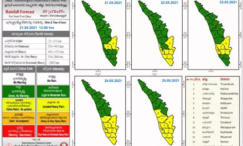 25-05-2021 : തിരുവനന്തപുരം, കൊല്ലം, പത്തനംതിട്ട, ആലപ്പുഴ, കോട്ടയം, എറണാകുളം, ഇടുക്കി, തൃശ്ശൂര് എന്നീ ജില്ലകളില് മഞ്ഞ അലര്ട്ട് പ്രഖ്യാപിച്ചു.