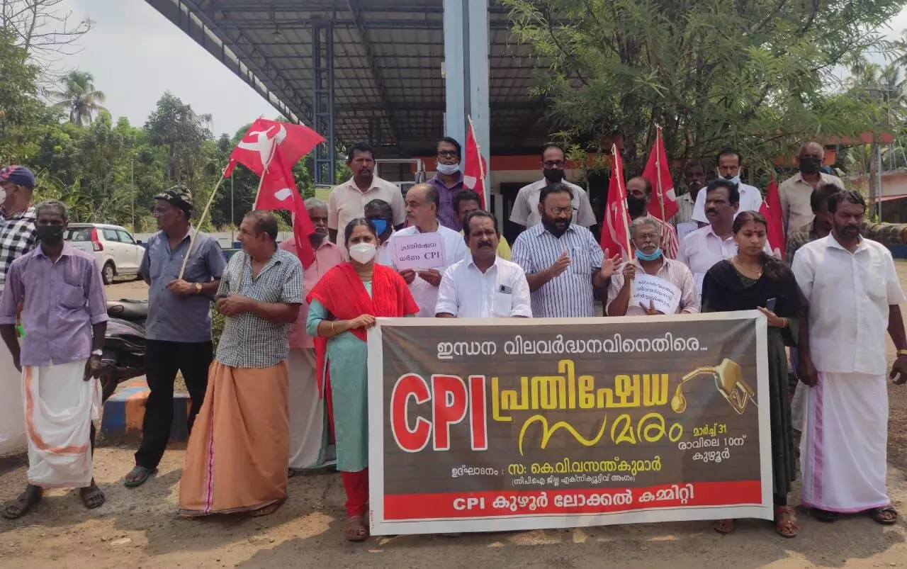 ഇന്ധന വിലവർധനവിന് എതിരായ പ്രതിഷധ ധർണയ്ക്ക് സിപിഐ കുഴൂർ ലോക്കൽ കമ്മറ്റിയംഗം പി എഫ് ജോൺസണ് അധ്യക്ഷത വഹിച്ചു. സിപിഐ ലോക്കൽ കമ്മറ്റി സെക്രട്ടറി എം ആർ അപ്പുക്കുട്ടൻ, രമ്യ ശ്രീജേഷ്, എ സി സുഗതൻ, കെ സി ഗോപി, എൻ എസ് താങ്കപ്പൻ, പി കെ അലി തുടങ്ങിയവർ സംസാരിച്ചു.