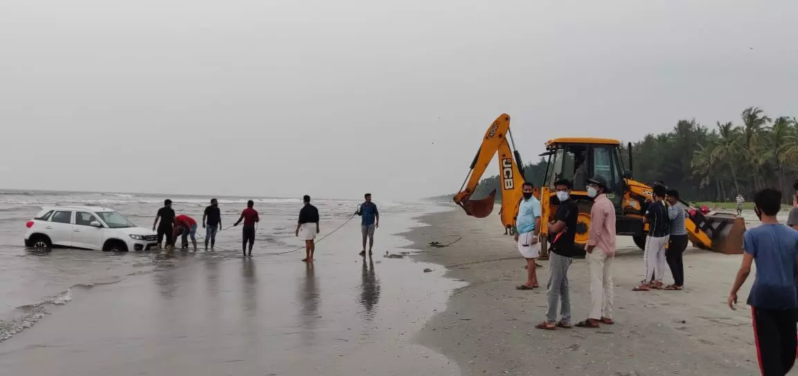 തീരത്തുകൂടി കാറോടിച്ചു പോകുമ്പോൾ മണ്ണിൽ താഴുകയായിരുന്നു. വേലിയിറക്കമുള്ള സമയത്ത് ആയിരുന്നു. കാർ കരകയറ്റാൻ നാട്ടുകാർ ശ്രമം നടത്തിയെങ്കിലും കടലിൽ വേലിയേറ്റം വന്നതോടെ വിഫലമായി. ഒടുവിൽ മണ്ണുമാന്തി വിളിച്ചുവരുത്തി കരക്ക് എത്തിക്കുകയായിരുന്നു. ഇതിനു മുമ്പും ഉല്ലാസത്തിനെത്തിയവരുടെ കാറുകൾക്ക് താഴ്ന്ന് പോയിരുന്നു ഇതേ തുടർന്ന് നാട്ടുകാർ തീരത്ത് ഇറക്കുന്നത് തടയുകയും ഇതേ തുടർന്ന് ഉല്ലാസത്തിനെത്തുന്നവരുമായി സംഘർഷമുണ്ടാകുകയും ചെയ്തിരുന്നു.