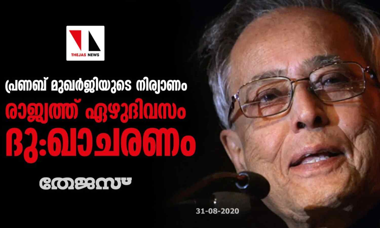 മുന് രാഷ്ട്രപതി പ്രണബ് മുഖര്ജിയുടെ നിര്യാണത്തില് ആദരസൂചകമായി രാജ്യത്ത് ദു:ഖാചരണം പ്രഖ്യാപിച്ചതിന്റെ ഭാഗമായി സംസ്ഥാനത്തും സപ്തംബര് ആറുവരെ സംസ്ഥാനത്തും ദു:ഖം ആചരിക്കും. സപ്തംബര് ആറുവരെ ദേശീയപതാക പകുതി താഴ്ത്തി ക്കെട്ടും. ഔദ്യോഗികമായ ആഘോഷപരിപാടികളും ഈ ദിനങ്ങളിലുണ്ടായിരിക്കില്ല. സ്ഥിരമായി ദേശീയപതാക ഉയര്ത്തിയിരിക്കുന്ന സ്ഥാപനങ്ങളില് പതാക പകുതി താഴ്ത്തിക്കെട്ടാന് നടപടി സ്വീകരിക്കാന് സര്ക്കാര് ജില്ലാ കലക്ടര്മാര്ക്ക് നിര്ദേശം നല്കി.