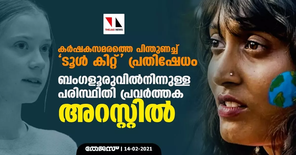 കര്ഷകസമരത്തെ പിന്തുണച്ച് 'ടൂള് കിറ്റ്' പ്രതിഷേധം: ബംഗളൂരുവില്നിന്നുള്ള പരിസ്ഥിതി പ്രവര്ത്തക അറസ്റ്റില്