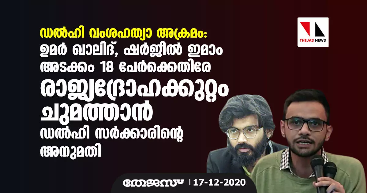 ഡല്ഹി വംശഹത്യാ അക്രമം: ഉമര് ഖാലിദ്, ഷര്ജീല് ഇമാം അടക്കം 18 പേര്ക്കെതിരേ രാജ്യദ്രോഹക്കുറ്റം ചുമത്താന് ഡല്ഹി സര്ക്കാരിന്റെ അനുമതി