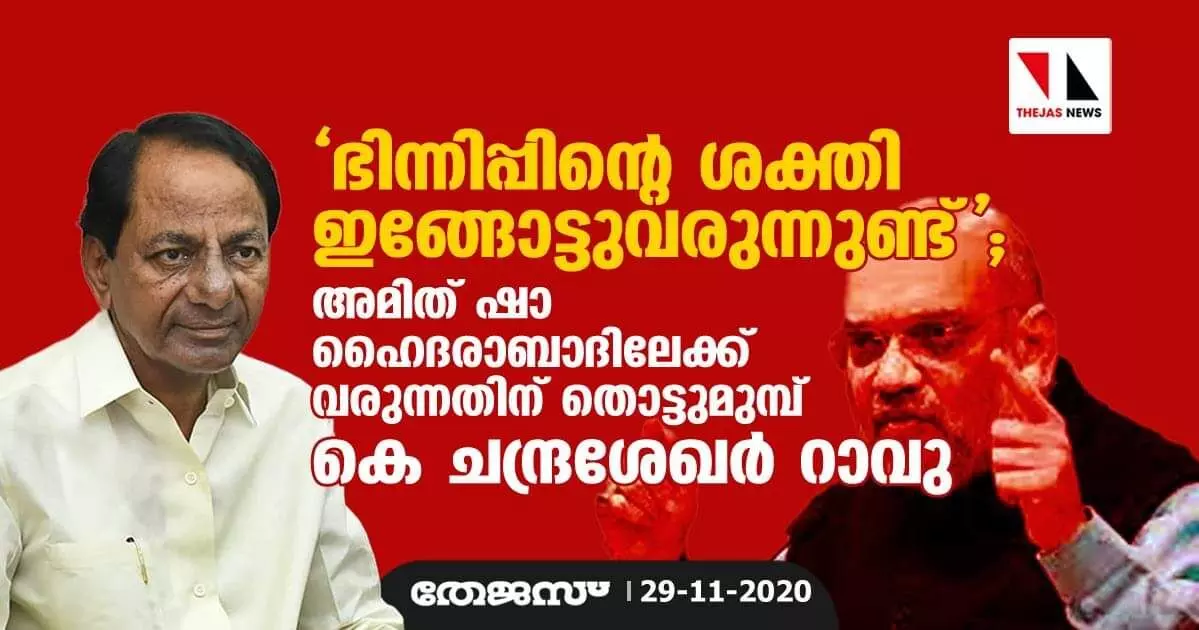 ഭിന്നിപ്പിന്റെ ശക്തി ഇങ്ങോട്ടുവരുന്നുണ്ട്'; അമിത് ഷാ ഹൈദരാബാദിലേക്ക് വരുന്നതിന് തൊട്ടുമുമ്പ് കെ ചന്ദ്രശേഖര് റാവു
