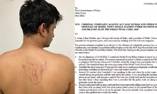 ആദ്യ അടിയില്തന്നെ നിലത്തുവീണു. തുടര്ന്ന് തന്റെ മുതുകിലും തോളിലും ചവിട്ടുകയും മര്ദ്ദിക്കുകയും ചെയ്തു. ക്രൂരമര്ദ്ദനത്തെത്തുടര്ന്ന് മുഖംതാഴ്ത്തിയിരുന്ന തന്റെ മുതുകിലും തലയിലും പിടിച്ച് കുനിച്ചുനിര്ത്തി വീണ്ടും പോലിസ് മര്ദ്ദനം തുടര്ന്നു. തന്റെ കണങ്കാലിന് പോലിസ് ചവിട്ടിയതിന്റെ മദ്രപതിഞ്ഞിട്ടുണ്ടെന്ന് പരാതിയില് ചൂണ്ടിക്കാട്ടുന്നു. രാജ്യതലസ്ഥാനത്ത് മൂന്നുമാസത്തിനുള്ളില് പോലിസിന്റെ ആക്രമണത്തിനിരയാവുന്ന കാരവന്റെ നാലാമത്തെ മാധ്യമപ്രവര്ത്തകനാണിത്.