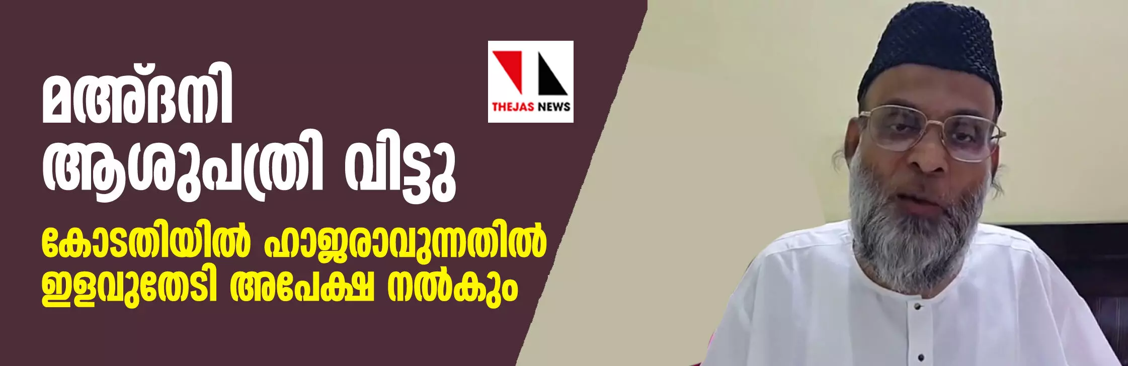 മഅ്ദനി ആശുപത്രി വിട്ടു; കോടതിയില് ഹാജരാവുന്നതില് ഇളവുതേടി അപേക്ഷ നല്കും
