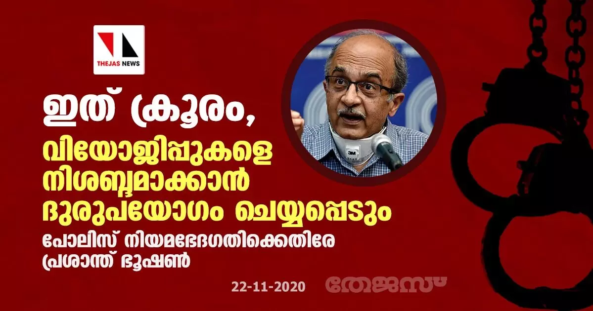 ഇത് ക്രൂരവും എതിര്ശബ്ദങ്ങളെ അടിച്ചമര്ത്തുകയും ചെയ്യുന്ന നിയമമാണ്. ഐടി ആക്ടില്നിന്ന് ഒഴിവാക്കിയ സെക്ഷന് 66 (എ)യ്ക്ക് സമാനമായ വകുപ്പാണിതെന്നും പ്രശാന്ത് ഭൂഷണ് ട്വീറ്റ് ചെയ്തു.
