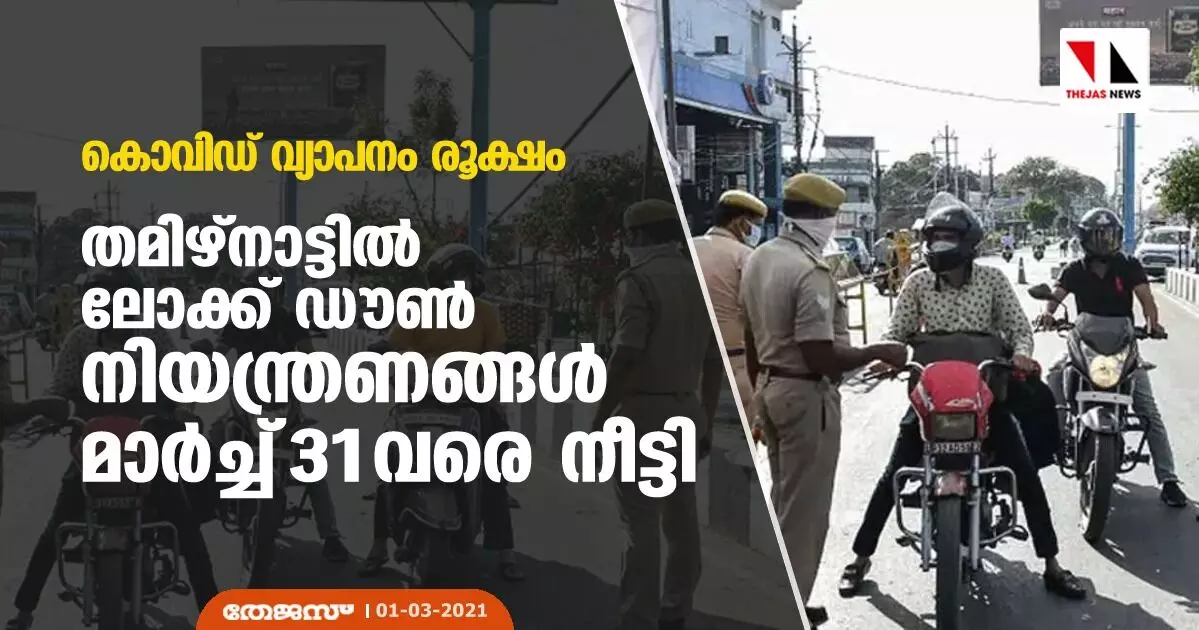 കൊവിഡ് വ്യാപനം രൂക്ഷം; തമിഴ്നാട്ടില് ലോക്ക് ഡൗണ് നിയന്ത്രണങ്ങള് മാര്ച്ച് 31 വരെ നീട്ടി