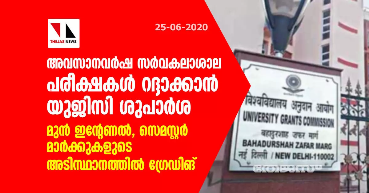 അവസാനവര്ഷ സര്വകലാശാല പരീക്ഷകള് റദ്ദാക്കാന് യുജിസി ശുപാര്ശ; മുന് ഇന്റേണല്, സെമസ്റ്റര് മാര്ക്കുകളുടെ അടിസ്ഥാനത്തില് ഗ്രേഡിങ്