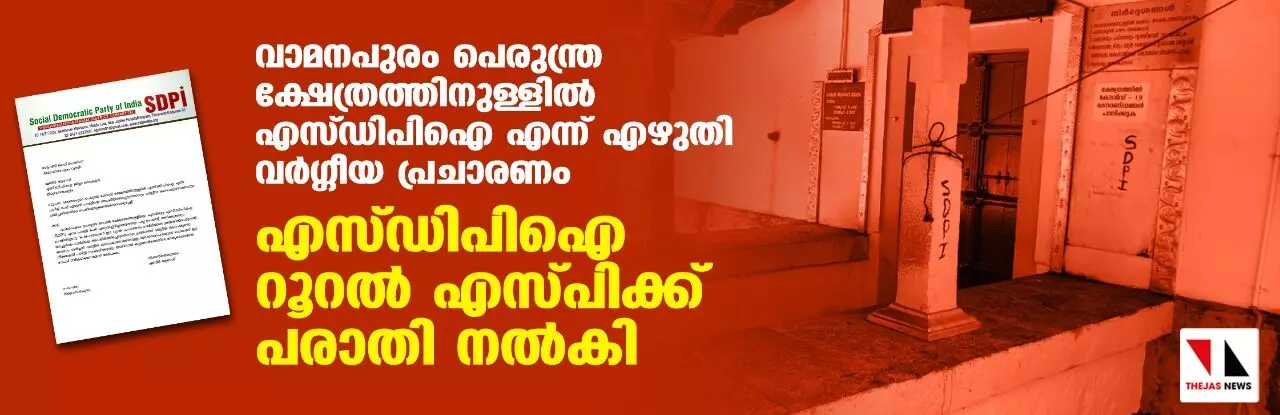 വാമനപുരം പെരുന്ത്ര ക്ഷേത്രത്തിനുള്ളില് എസ്ഡിപിഐ എന്ന് എഴുതി വര്ഗ്ഗീയ പ്രചാരണം; എസ്ഡിപിഐ റൂറല് എസ്പിക്ക് പരാതി നല്കി