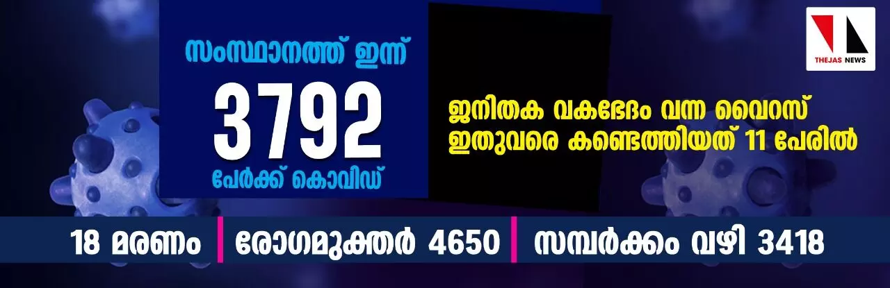 സംസ്ഥാനത്ത് ഇന്ന് 3,792 കൊവിഡ് രോഗികള്; ജനിതക വകഭേദം വന്ന വൈറസ് ഇതുവരെ കണ്ടെത്തിയത് 11 പേരില്