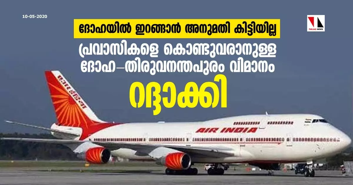 തിരുവനന്തപുരം: ദോഹയില് നിന്ന് തിരുവനന്തപുരത്തേക്ക് പ്രവാസികളെ കൊണ്ടുവരാനുള്ള എയര് ഇന്ത്യ എക്സ്പ്രസ് വിമാനം റദ്ദാക്കി. ഇന്ന് രാത്രി 10.45 ന് തിരുവനന്തപുരത്ത് എത്തേണ്ട വിമാനമാണ് ഖത്തർ സർക്കാരിന്റെ ലാൻഡിങ് പെർമിറ്റ് ലഭിക്കാത്തതു കാരണം റദ്ദാക്കിയത്. യാത്ര റദ്ദാക്കിയത് സംബന്ധിച്ച് തിരുവനന്തപുരം വിമാനത്താവളത്തില് അറിയിപ്പ് ലഭിച്ചു. ലാൻ്റിങ് അനുമതി ലഭിക്കാത്തതിൻ്റെ കാരണം വ്യക്തമല്ലെന്ന് തിരുവനന്തപുരം ജില്ലാ കലക്ടർ കെ ഗോപാലകൃഷ്ണ്ണൻ അറിയിച്ചു. ചൊവ്വാഴ്ച വിമാനം പുറപ്പെടും. സമയം നിശ്ചയിച്ചിട്ടില്ല.