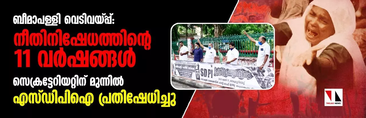തിരുവനന്തപുരം: ബീമാപള്ളിയില് ഇടതു സര്ക്കാരിന്റെ കാലത്ത് നിരപരാധികളായ ആറ് മുസ്ലിംകളെ പോലിസ് വെടിവെച്ചു കൊന്നിട്ട് നാളേക്ക് 11 വര്ഷം പൂര്ത്തിയാവുന്നു. ഒരു പതിറ്റാണ്ട് പിന്നിട്ടിട്ടും ഇരകളുടെ കുടുംബങ്ങളോടുള്ള ഭരണകൂടത്തിൻ്റെ നീതി നിഷേധത്തിനെതിരെ സെക്രട്ടേറിയറ്റിന് മുന്നിൽ എസ്ഡിപിഐ ജില്ലാക്കമ്മിറ്റി പ്രതിഷേധം സംഘടിപ്പിച്ചു. ഇരകളോട് നീതി കാണിക്കുക, കമ്മീഷൻ റിപോർട്ട് നിയമസഭയിൽ ചർച്ച ചെയ്യുക, കുറ്റക്കാരായ പോലിസുകാരെ ശിക്ഷിക്കുക തുടങ്ങിയ ആവശ്യങ്ങൾ ഉന്നയിച്ചായിരുന്നു പ്രതിഷേധം. നാളെ സമ്പൂർണ ലോക്ക് ഡൗണായതിനാലാണ് ഇന്ന് പ്രതിഷേധദിനം സംഘടിപ്പിച്ചതെന്ന് ഭാരവാഹികൾ പറഞ്ഞു. നാളെ എല്ലാ വീടുകൾക്ക് മുന്നിലും പ്രവർത്തകർ കുടുംബസമേതം പ്രതിഷേധിക്കും.