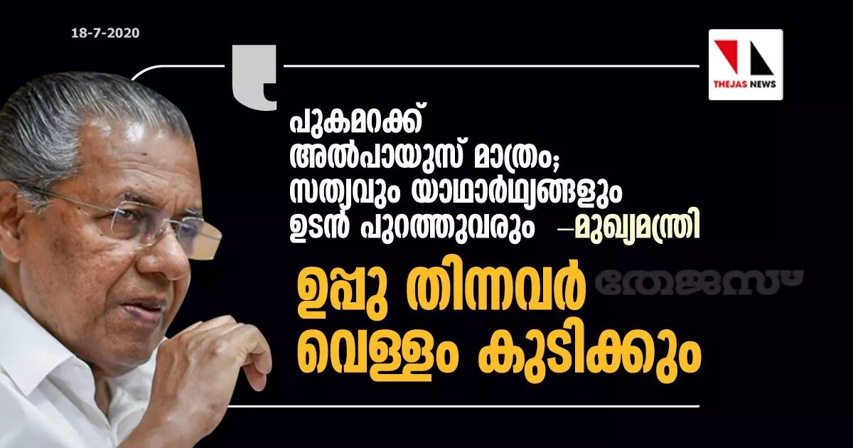 കഴിഞ്ഞ കാലത്തേതുപോലെയാണോ ഇപ്പോൾ മുഖ്യമന്ത്രിയുടെ ഓഫീസ്? അത് അറിയാത്തവരാണോ ഈ നാട്ടിലുള്ളത്? ജനങ്ങളാണ് ഇതിനെല്ലാം വിധികർത്താക്കൾ. പുകമറയ്ക്കൊക്കെ ചെറിയ ആയുസ്സേ ഉള്ളൂ. സത്യങ്ങളും വസ്തുതകളും പുറത്തുവരും. അപ്പോൾ ഈ പ്രചരണമൊക്കെ വന്നതുപോലെ തിരിച്ചുപോകും. അത് പതിക്കുമെന്ന് ഉറപ്പുള്ളവർക്ക് വല്ലാത്ത വേവലാതിയുണ്ട്. അന്വേഷണം പൂർത്തിയാകുന്നതോടെ ഇത് ബോധ്യപ്പെടും. അതിനു മുമ്പ് ചില മാധ്യമങ്ങൾ വഴി കള്ള കഥകളും തിരകഥകളും പ്രചരിപ്പിക്കുകയാണ്. ഇവക്ക് അൽപായുസ് മാത്രം. ഉപ്പ് തിന്നവർ വെള്ളം കുടിക്കും - മുഖ്യമന്ത്രി വ്യക്തമാക്കി.