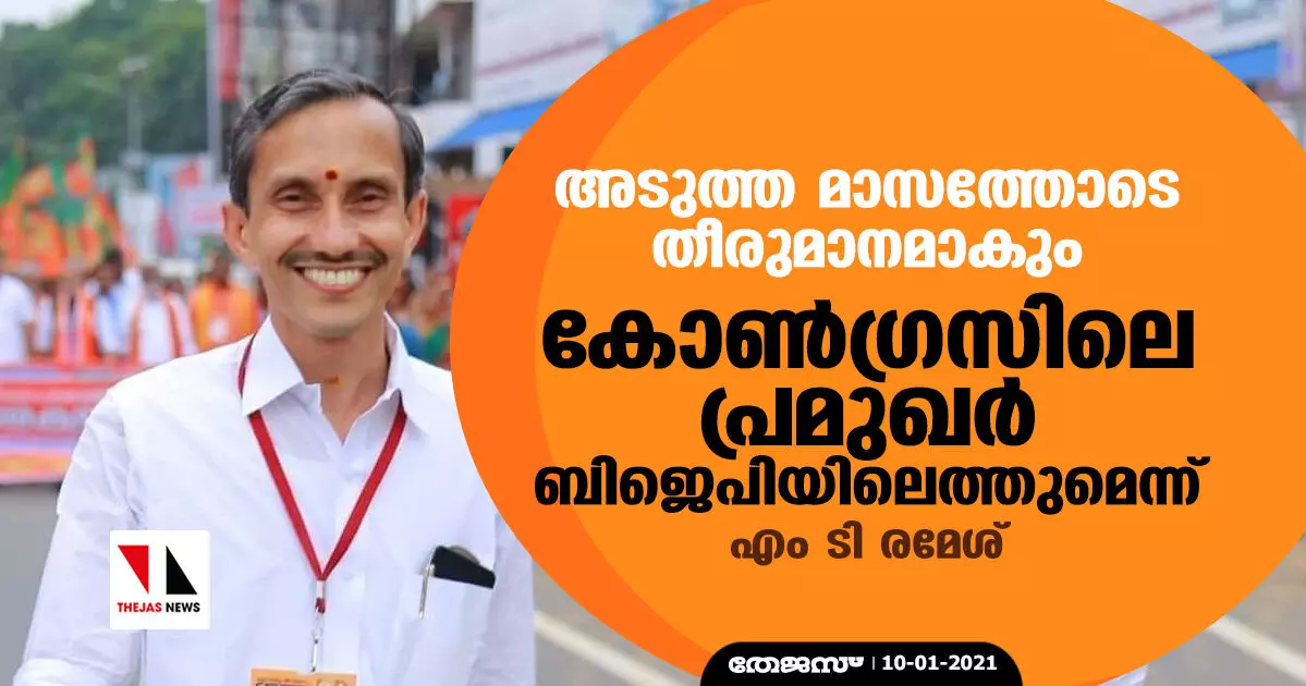 അടുത്ത മാസത്തോടെ തീരുമാനമാകും; കോണ്ഗ്രസിലെ പ്രമുഖര് ബിജെപിയിലെത്തുമെന്ന് എംടി രമേശ്