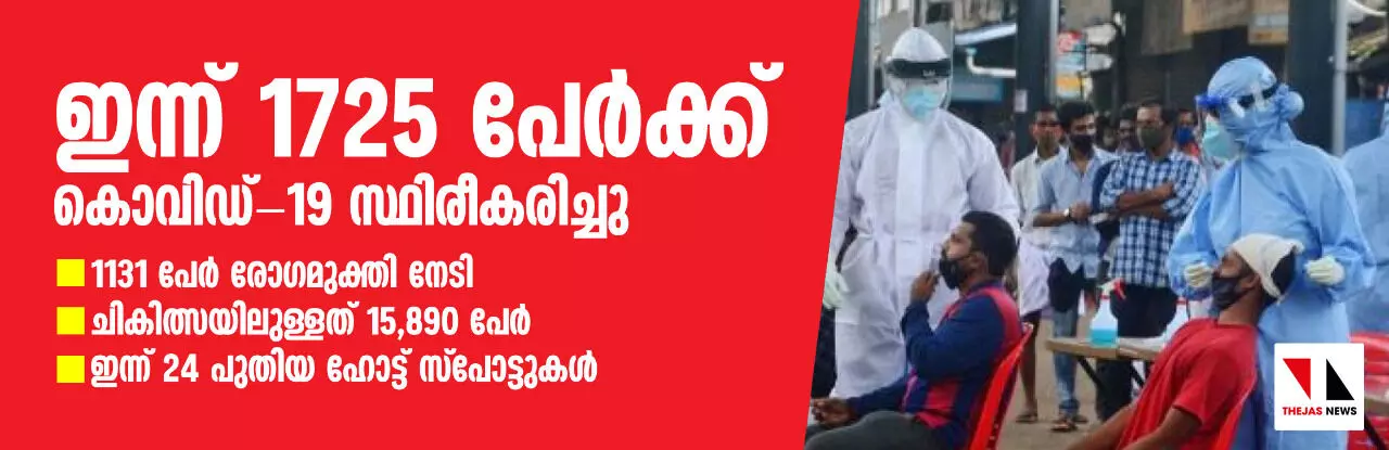 സംസ്ഥാനത്ത് ഇന്ന് 1,725 പേര്ക്ക് കൊവിഡ്; സമ്പര്ക്കത്തിലൂടെ 1,572 പേര്ക്ക് രോഗബാധ, 1,131 പേര് രോഗമുക്തരായി