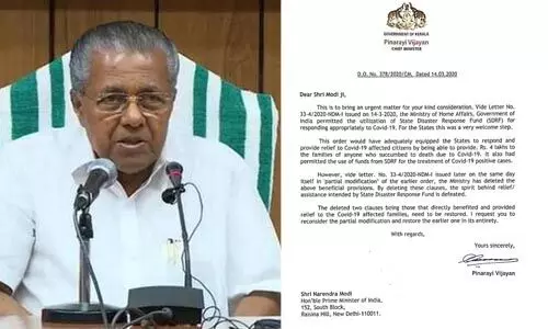 കൊവിഡ് 19: ധനസഹായം നല്കില്ലെന്ന ഉത്തരവ് പിന്വലിക്കണം; പ്രധാനമന്ത്രിക്ക് മുഖ്യമന്ത്രിയുടെ കത്ത്