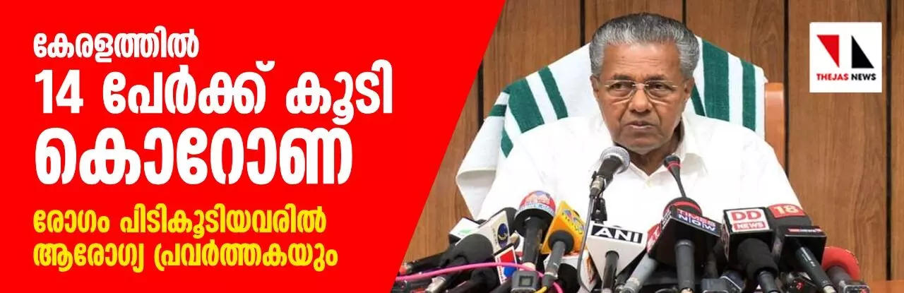 തിരുവനന്തപുരം: ഇന്ന് കേരളത്തില് 14 പേര്ക്ക് കോവിഡ് 19 സ്ഥിരികരിച്ചതായി മുഖ്യമന്ത്രി പിണറായി വിജയന്. രോഗം പിടിപെട്ടവരിൽ ആരോഗ്യ പ്രവർത്തകയും ഉൾപ്പെടുന്നു. കാസർഗോഡ് 6, കോഴിക്കോട് 3, മലപ്പുറം 1, പാലക്കാട് 1, കോട്ടയം 1, എറണാകുളം 1, ആലപ്പുഴ 1 എന്നിങ്ങനെയാണ് രോഗം സ്ഥിരീകരിച്ചത്.