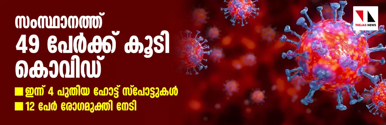സംസ്ഥാനത്ത് 49 പേര്ക്ക് കൂടി കൊവിഡ്; ഇന്ന് 4 പുതിയ ഹോട്ട് സ്പോട്ടുകള്, 12 പേര് രോഗമുക്തി നേടി