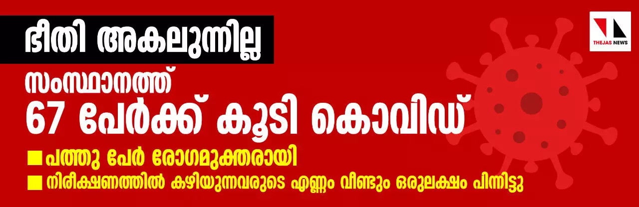 ഭീതി അകലുന്നില്ല; സംസ്ഥാനത്ത് 67 പേർക്ക് കൂടി കൊവിഡ്