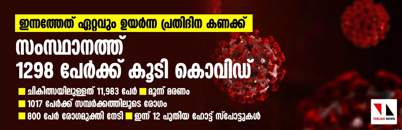 സംസ്ഥാനത്ത് 1298 പേര്ക്ക് കൂടി കൊവിഡ്; 1017 പേര്ക്ക് സമ്പര്ക്കത്തിലൂടെ രോഗം