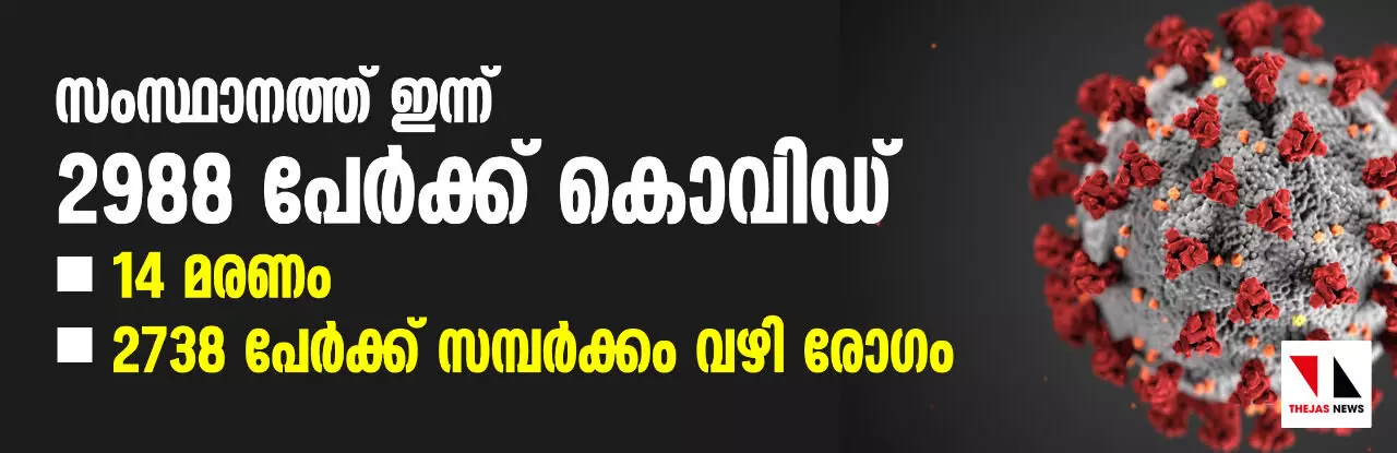 സംസ്ഥാനത്ത് ഇന്ന് 2988 പേര്ക്ക് കൊവിഡ്; 14 മരണം, 2738 പേര്ക്ക് സമ്പര്ക്കം വഴി രോഗം
