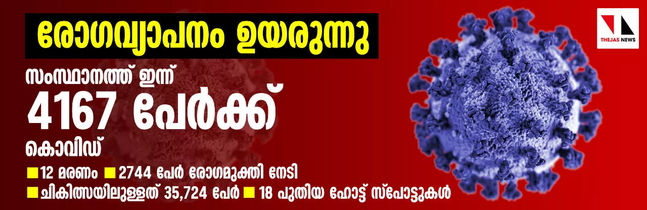 രോഗവ്യാപനം ഉയരുന്നു; സംസ്ഥാനത്ത് ഇന്ന് 4167 പേര്ക്ക് കൊവിഡ്, 12 മരണം