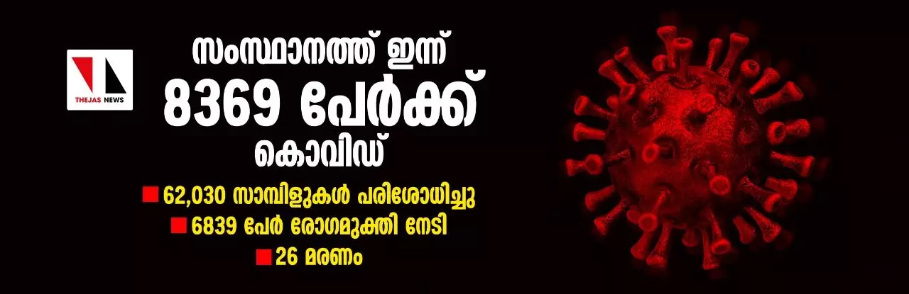 സംസ്ഥാനത്ത് ഇന്ന് 8369 പേര്ക്ക് കൊവിഡ്; 62,030 സാമ്പിളുകള് പരിശോധിച്ചു, 6839 പേര് രോഗമുക്തി നേടി