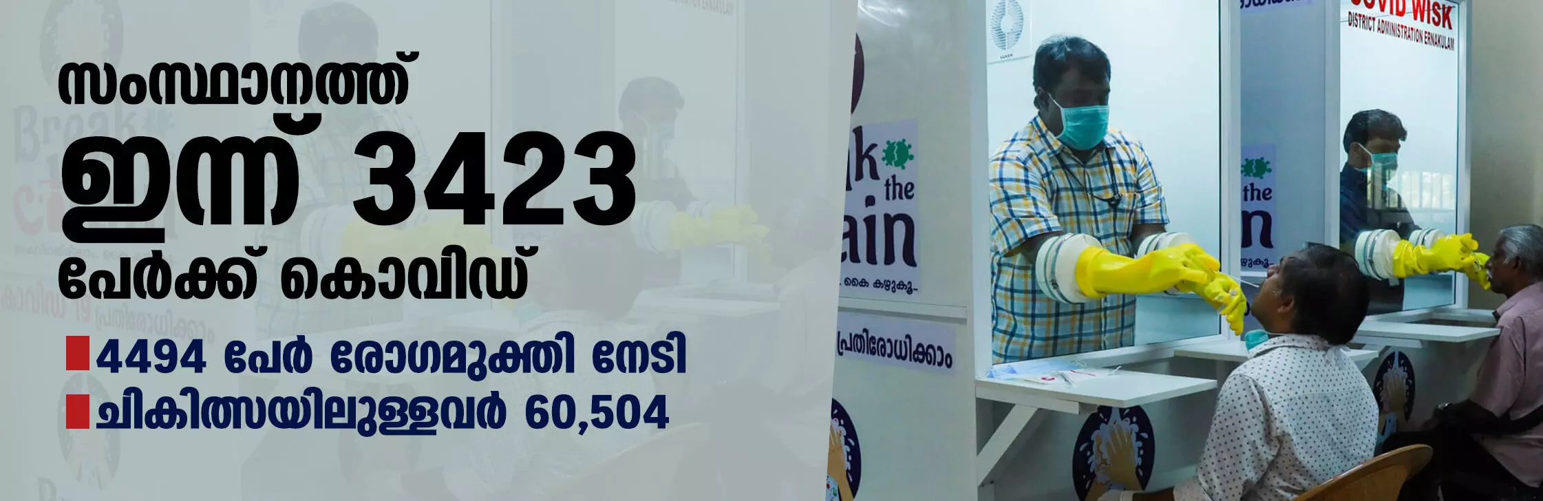സംസ്ഥാനത്ത് ഇന്ന് 3,423 കൊവിഡ് രോഗികള്; 4,494 പേര്ക്ക് രോഗമുക്തി, 27 മരണം