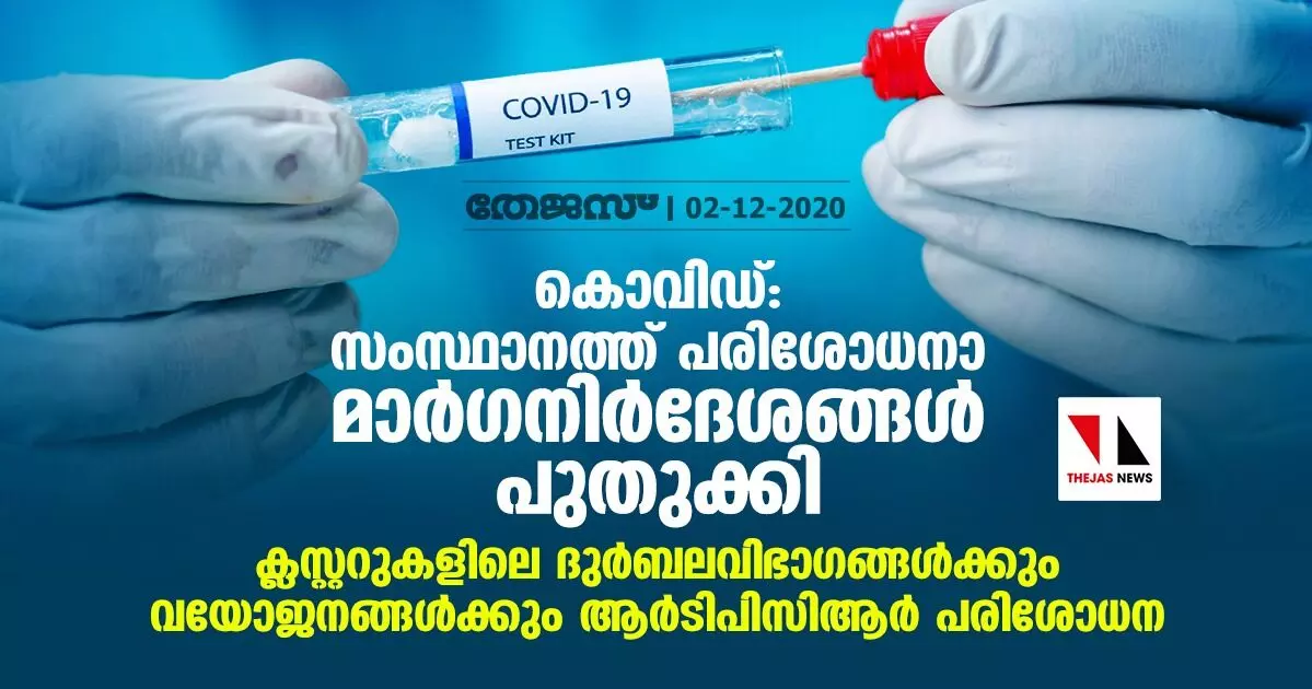 കൊവിഡ്: സംസ്ഥാനത്ത് പരിശോധനാ മാര്ഗനിര്ദേശങ്ങള് പുതുക്കി; ക്ലസ്റ്ററുകളിലെ ദുര്ബലവിഭാഗങ്ങള്ക്കും വയോജനങ്ങള്ക്കും ആര്ടിപിസിആര് പരിശോധന