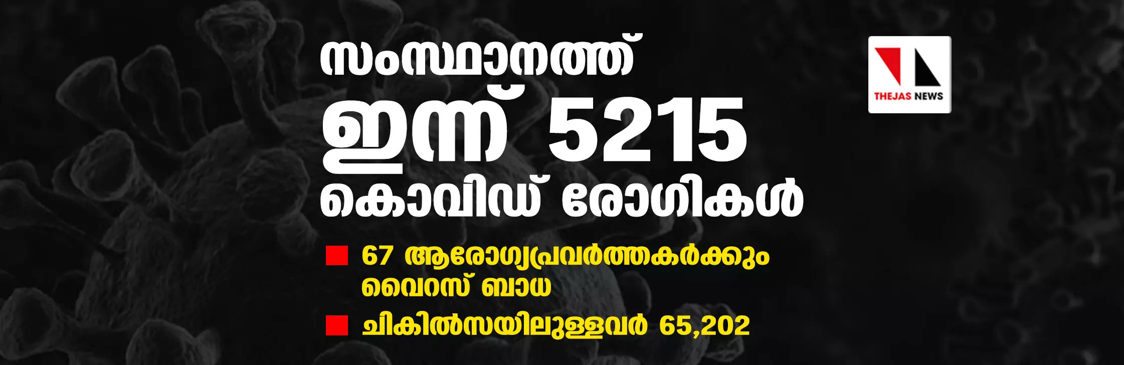 സംസ്ഥാനത്ത് ഇന്ന് 5,215 കൊവിഡ് രോഗികള്; 67 ആരോഗ്യപ്രവര്ത്തകര്ക്കും വൈറസ് ബാധ; ചികില്സയിലുള്ളവര് 65,202