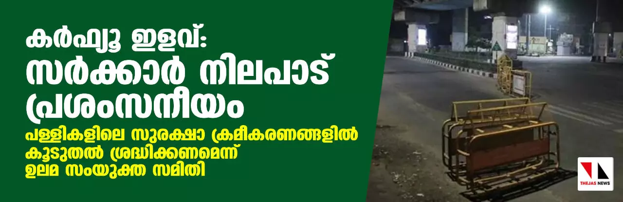 കര്ഫ്യൂ ഇളവ്: സര്ക്കാര് നിലപാട് പ്രശംസനീയം; പള്ളികളിലെ സുരക്ഷാ ക്രമീകരണങ്ങളില് കൂടുതല് ശ്രദ്ധിക്കണമെന്ന് ഉലമ സംയുക്ത സമിതി