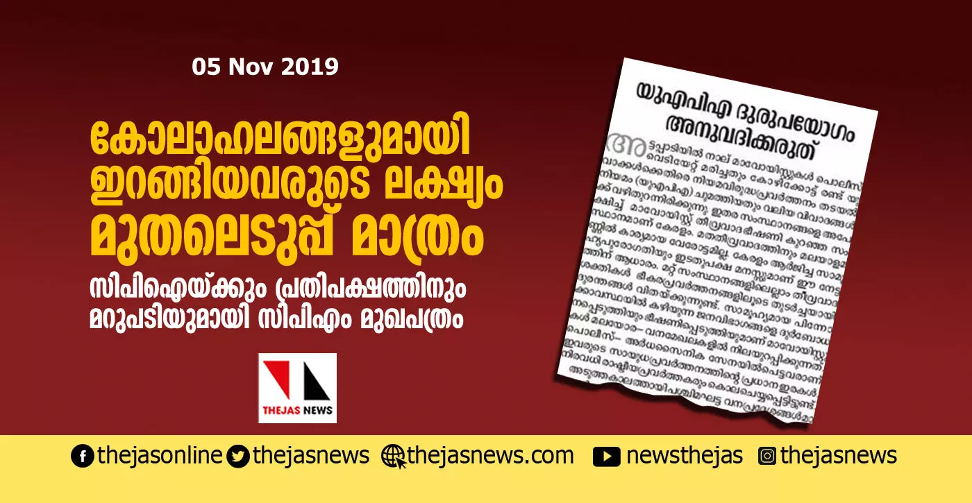 അട്ടപ്പാടിയില് ഇപ്പോഴുണ്ടായ ഏറ്റുമുട്ടല് മരണങ്ങളുടെപേരിലും പഴയ വിവാദം തുടരുകയാണ്. തിരച്ചിലിനിടയിലും ഇന്ക്വസ്റ്റ് വേളയിലും പോലിസിനുനേരെ നടന്ന ആക്രമണങ്ങളുടെ തെളിവുകള് ഇതിനകം പുറത്തുവന്നിട്ടുണ്ട്. ഉന്നത ഉദ്യോഗസ്ഥരടക്കം തലനാരിഴയ്ക്കാണ് രക്ഷപ്പെട്ടത്. രാജ്യദ്രോഹവും ഭീകരപ്രവര്ത്തനവും ആരോപിച്ച് പൗരന്മാരെ പീഡിപ്പിക്കുകയും മനുഷ്യാവകാശങ്ങള് നിഷേധിക്കുകയുംചെയ്യുന്ന ഭരണകൂടഭീകരതയെ ഒരിക്കലും കുറച്ചുകാണേണ്ടതില്ല. യുഎപിഎ കരിനിയമമാണ്. ദുരുപയോഗസാധ്യത മുന്നിര്ത്തി പാസാക്കുന്ന ഘട്ടത്തില്തന്നെ എതിര്ത്തത് സിപിഎമ്മും ഇടതുപക്ഷവുമാണ്. പ്രതീക്ഷിച്ചപോലെ ആ നിയമം ദുരുപയോഗിക്കപ്പെട്ടുവെന്നും മുഖപ്രസംഗത്തില് വ്യക്തമാക്കുന്നു.